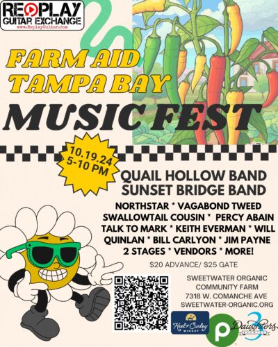 Florida favorites Quail Hollow Band and Sunset Bridge Band headline the 2nd Annual Farm Aid Tampa Bay Music Fest, presented by Replay Guitar Exchange with refreshment sponsors Three Daughters Brewing, Keel & Curley Winery, and Publix! Enjoy toetapping jam bands Northstar, Vagabond Tweed, and Talk to Mark, and an intimate farmhouse concert with international peace-prize-winner Percy Abain, Austin Americana balladdeer Keith Everman, folk-rock poet Will Quinlan, the harmonies of Swallowtail Cousin’s Liz Alden & Tony Purnell, and more! Plus foodie vendors, local creatives, and cameo’s by Tampa Bay garden-to-table champions. Get a little taste of the national Farm Aid Festival and support nonprofit Sweetwater’s organic education programs. Kids attend free. Well-behaved leashed dogs welcome.