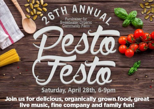 Sweetwater Organic Community Farm’s 26th Annual PestoFesto Fundraising Party is full of community spirit featuring our famous farm-fresh organic pesto pasta and salad, rolls, dessert, and juice. Locally-brewed beer, select wine, and organic coffee available by donation.
