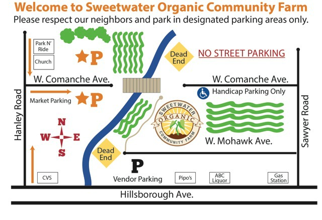 Parking on Comanche Avenue off of Hanley Road is the preferred parking area (see above). However, Thursday CSA Members and Sunday Market Vendors may chose to park in the limited space available along the chainlink fence on the south end of our property on Mohawk Avenue. Traveling west on Hillsborough Ave. from the Veteran’s Expressway, turn right on Sawyer Rd. (Shell station.) Take the next left on Mohawk Ave. Drive to the end and park along the chainlink fence. Walk through the opening in the fence, down the driveway to the farm.